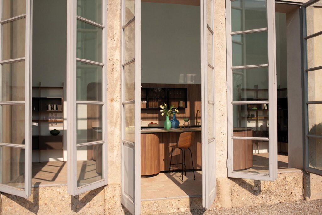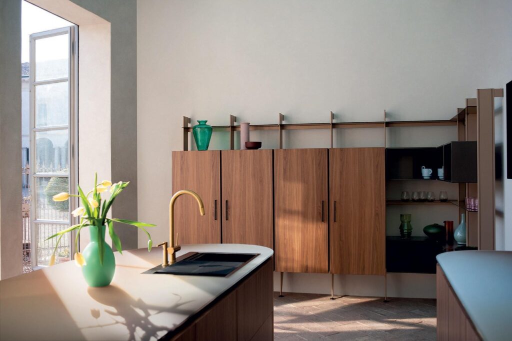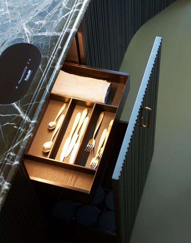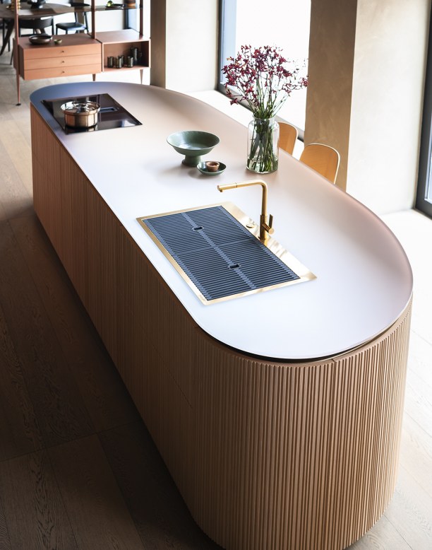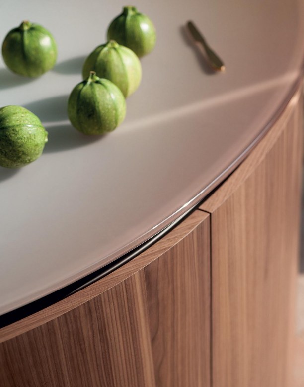 Tangram is made up five curved elements that can be combined with straight elements at will, to build kitchen islands with unusual shapes, compositions set against the wall, or even solutions that wrap around corners.